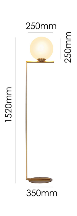 | Height: 1520mm Width: 250mm Base: 350mm Shade: 250x250mm Colour/Material: Antique Gold Metal Base, Opal Glass Ball Shade |