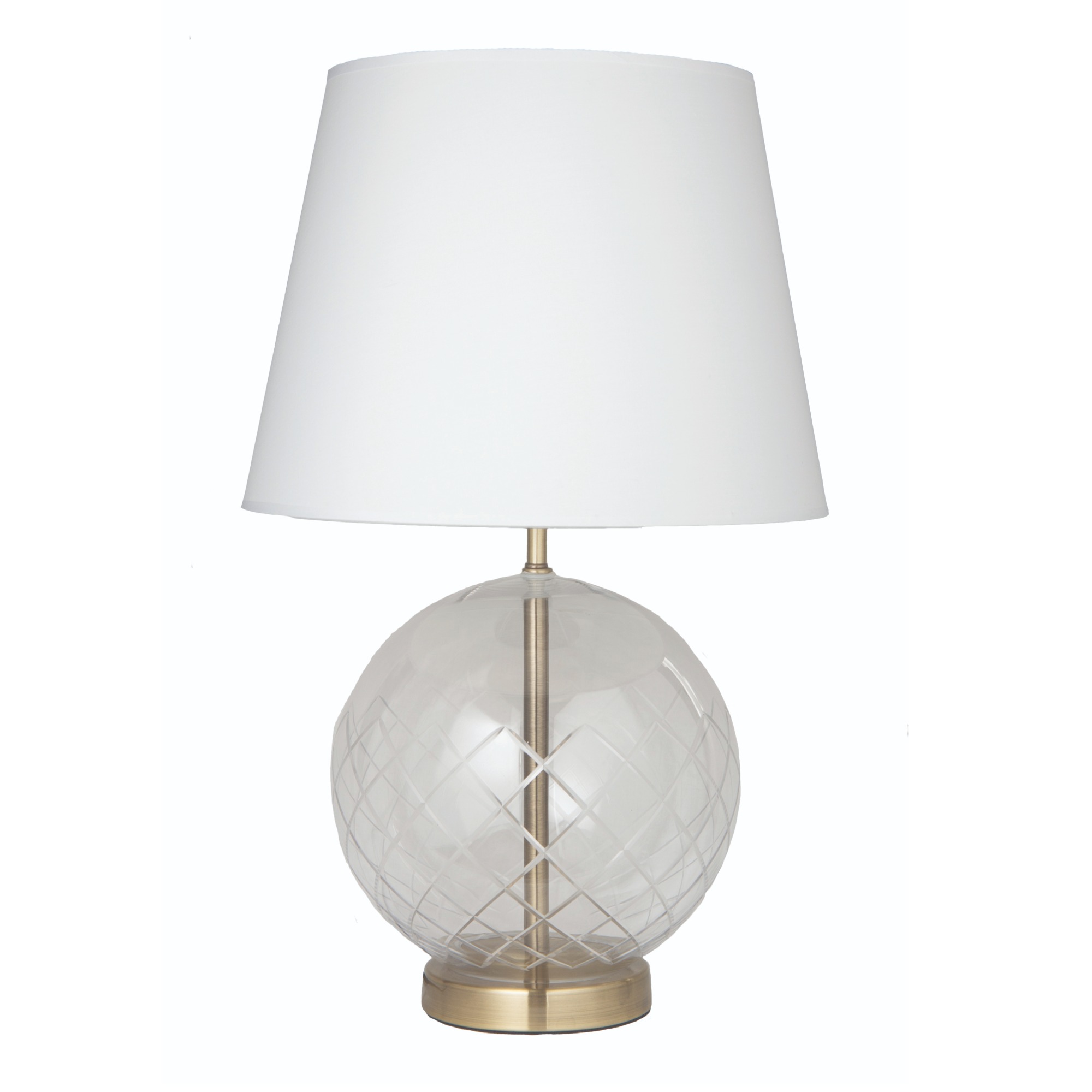 | Height: 560mm Width: 350mm Base: 140mm Shade: 250x350x265mm Colour/Material: Antique Brass / Etched Glass Base, White Round Tapered Shade |