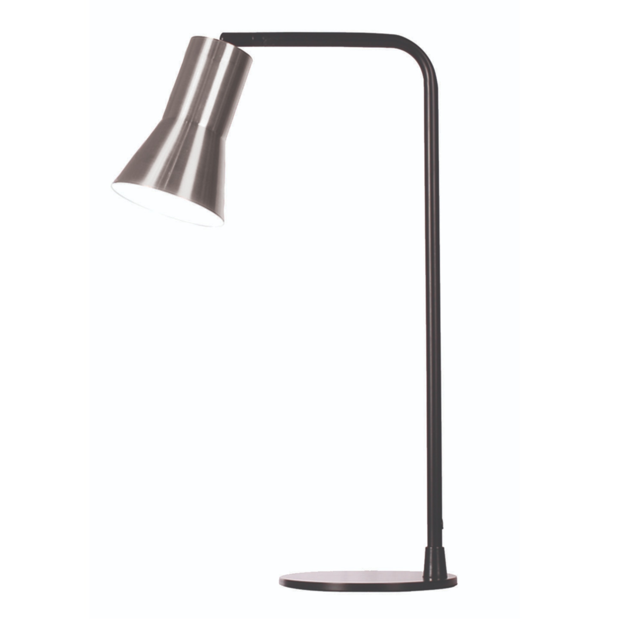 This LLT Akka Nickel Table Lamp features a minimalist L-shaped frame with a professional black painted finish. This slender metal arm supports a distinctive cone-shaped shade in a polished nickel finish.