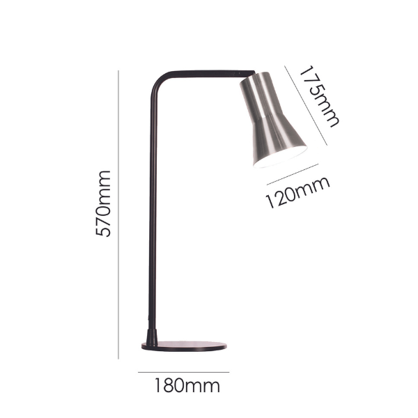 | Height: 570mm Base: 180mm Shade: 120x175mm Colour/Material: Black Painted Metal Base / Nickel Finish Metal Shade |