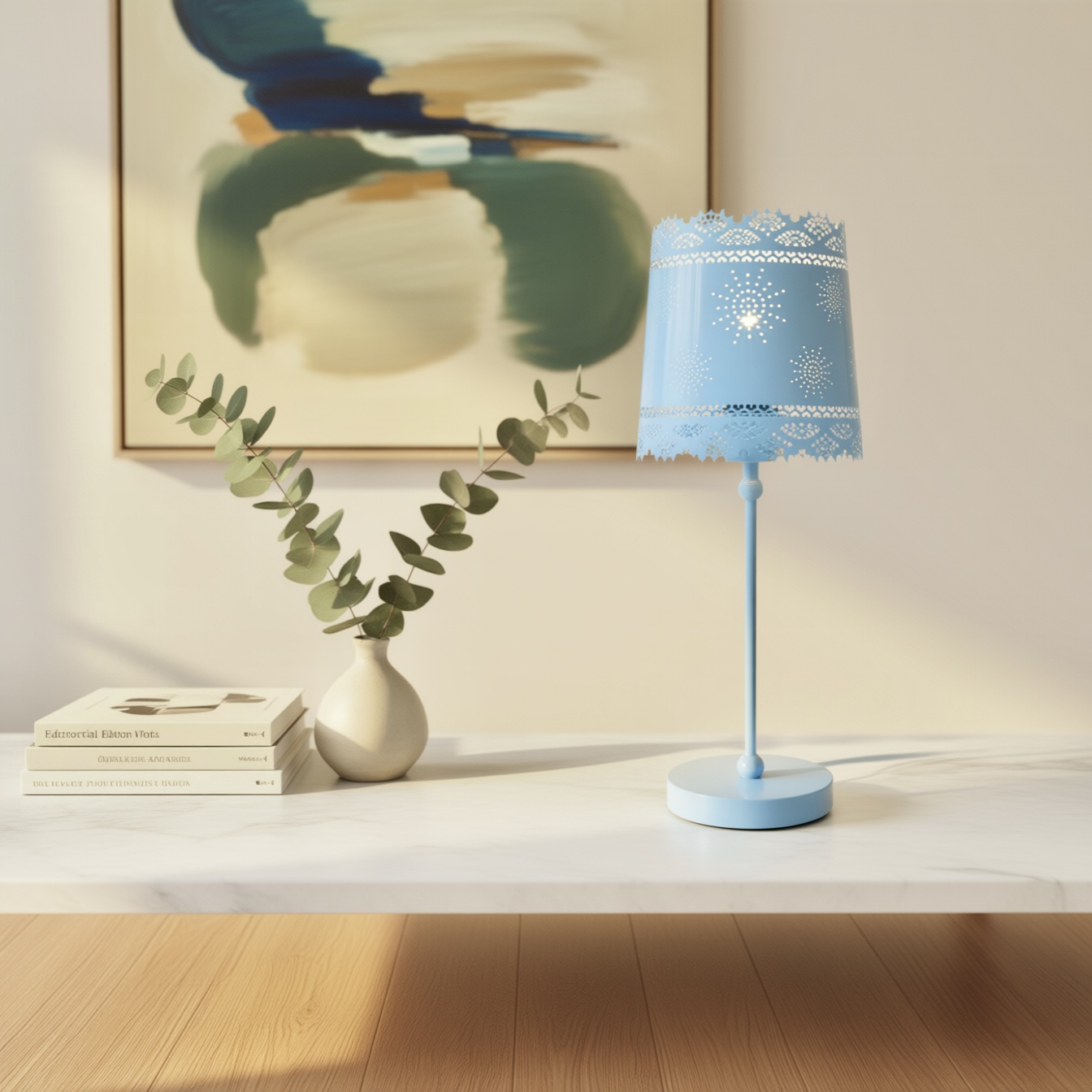Featuring a delicate laser-cut metal shade in a soft sky-blue finish, it casts intricate light patterns that bring warmth and personality to your space.