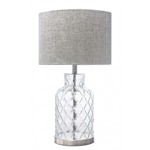 This LLT Ariel Grey Glass Table Lamp features an exquisite clear glass base with an intricate, embossed diamond pattern. The detailed glass body sits on a sleek brushed nickel foundation for a clean and polished look.