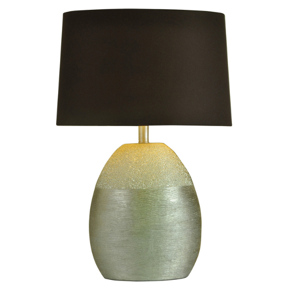 The LLT Auburn Table Lamp stands 660mm tall, featuring a stunning egg-shaped ceramic base with a unique two-tone silver and gold textured finish.