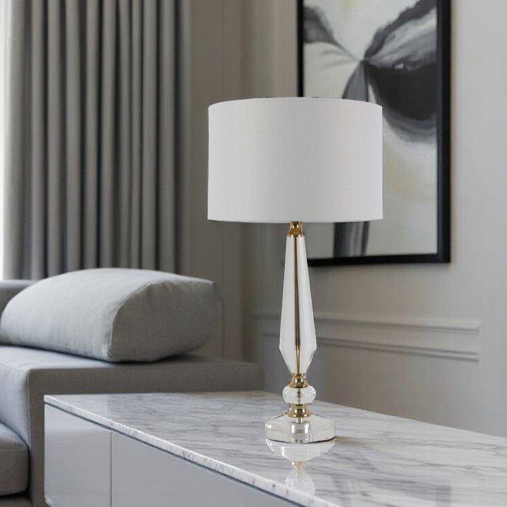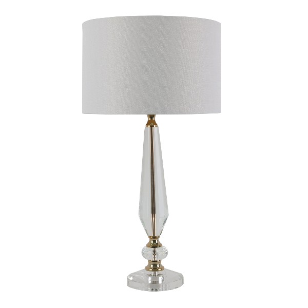 Colour/Material: Gold Plated Metal / Crystal base, White Linen Drum Shade