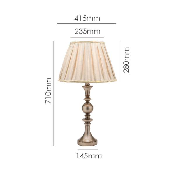 | Height: 710mm Base: 145mm Shade: 415x280x235mm Colour/Material: Pewter Base, Grey Box Pleat Shade |