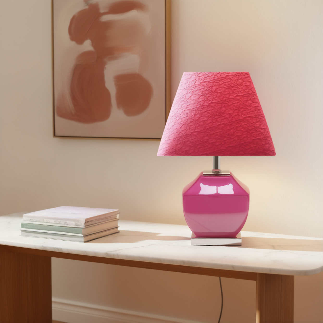 LLT Chai Pink Table Lamp adds a playful yet sophisticated touch to your home décor. Its glossy pink ceramic base pairs beautifully with a self-patterned pink net shade, creating a gentle and inviting glow when lit.