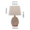 This lamp stands 600mm tall. Its oval shade balances the rounded base, so the design feels warm and inviting. In addition, the neutral colour scheme blends easily with timber furniture and light interiors.