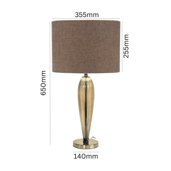 | Height: 650mm Width: 355mm Colour/Material: Black Chrome Smoke Glass Base, Brown Linen Oval Shade |