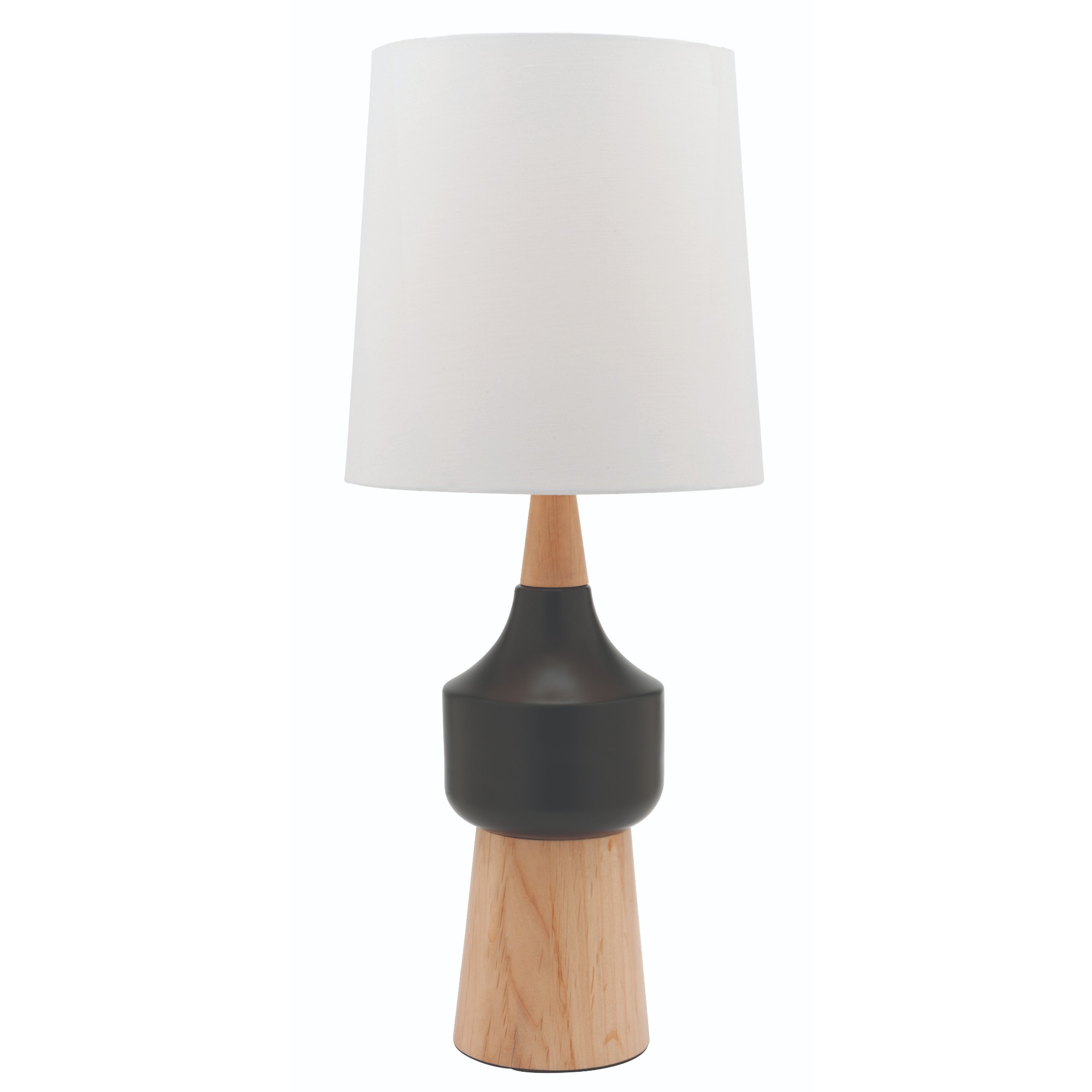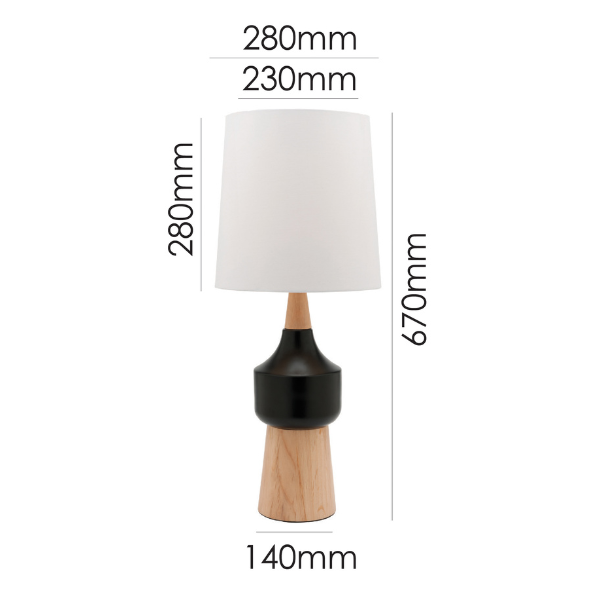 Colour/Material: Black Ceramic / Timber Veneer Base, White Cotton Round Tapered Shade