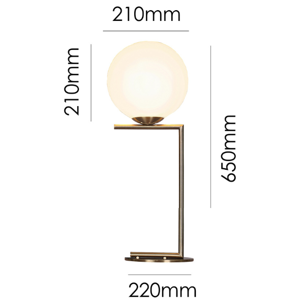 | Height: 650mm Width: 210mm Base: 220mm Shade: 210x210mm Colour/Material: Antique Gold Metal Base, Opal Glass Ball Shade |