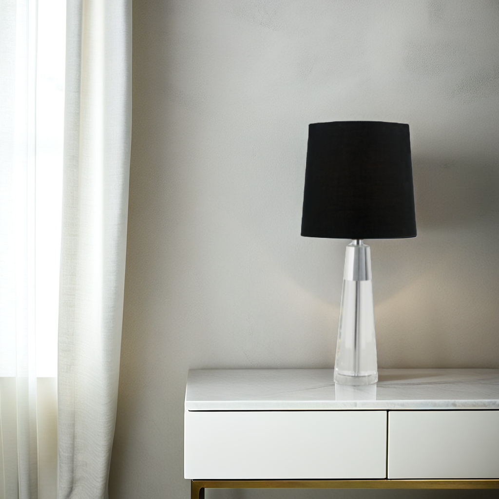 LLT Evie Black Table Lamp features a tapered crystal base with chrome accents and a black drum shade. A 460mm tall sophisticated statement piece.
