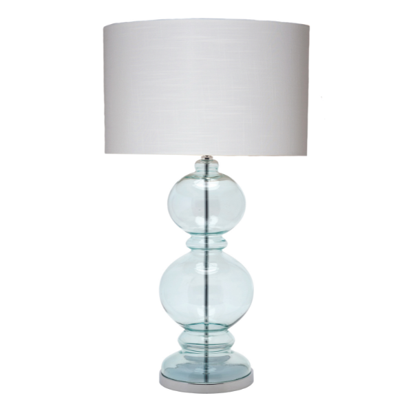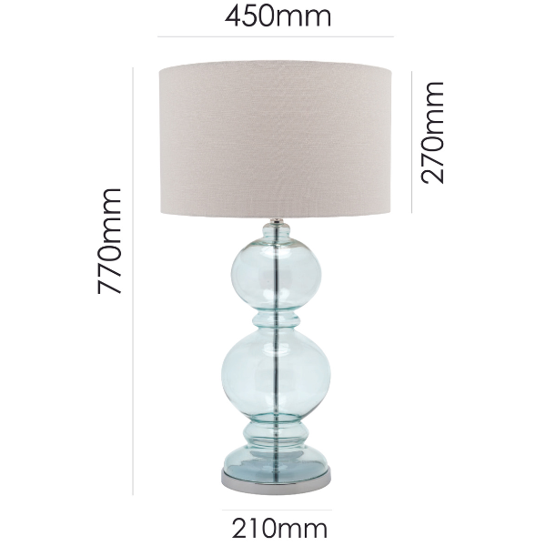 | Height: 770mm Width: 450mm Base: 210mm Shade: 450x270mm Colour/Material:Chrome / Blue Tinted Glass Base, White Linen Drum Shade |