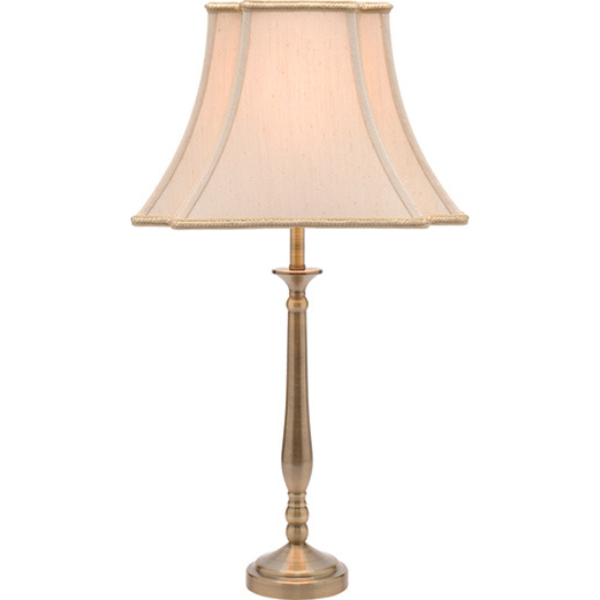 | Height: 570mm Width: 285mm Base: 110mm Shade: 170x285x215mm Colour/Material: Antique Brass Base / Beige Deluxe Shade |
