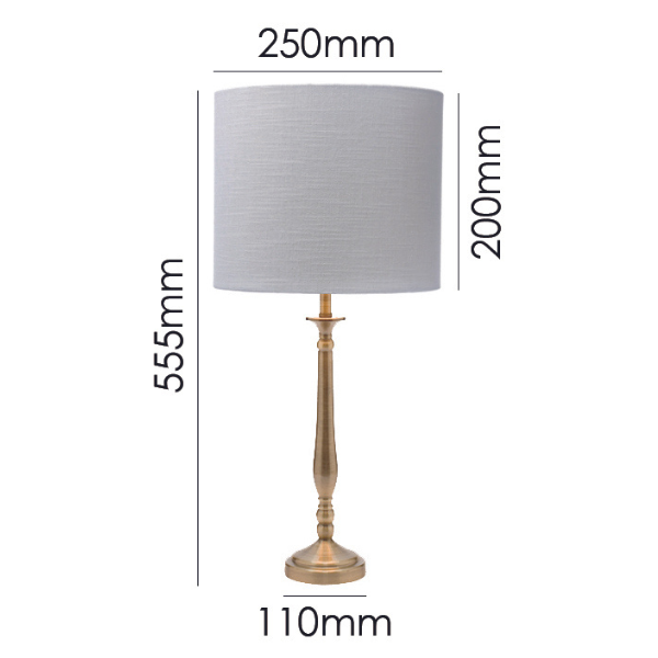 | Height: 560mm Width: 25mm Base: 110mm Shade: 250x200mm Colour/Material: Antique Brass Base / White Linen Drum Shade |