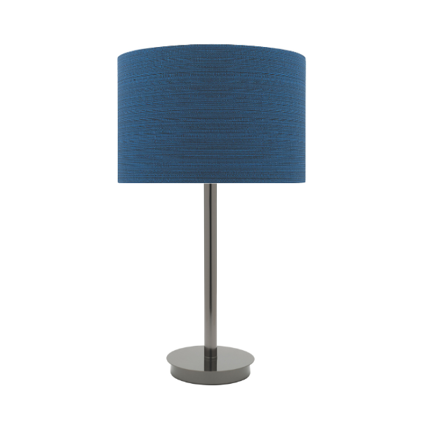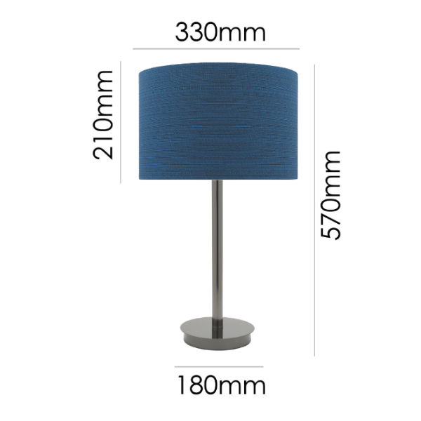 | Height: 570mm Width: 330mm Shade: 330x210mm Colour/Material: Black Chrome Base/ Blue Textured Drum Shade(Velcro Tape) |
