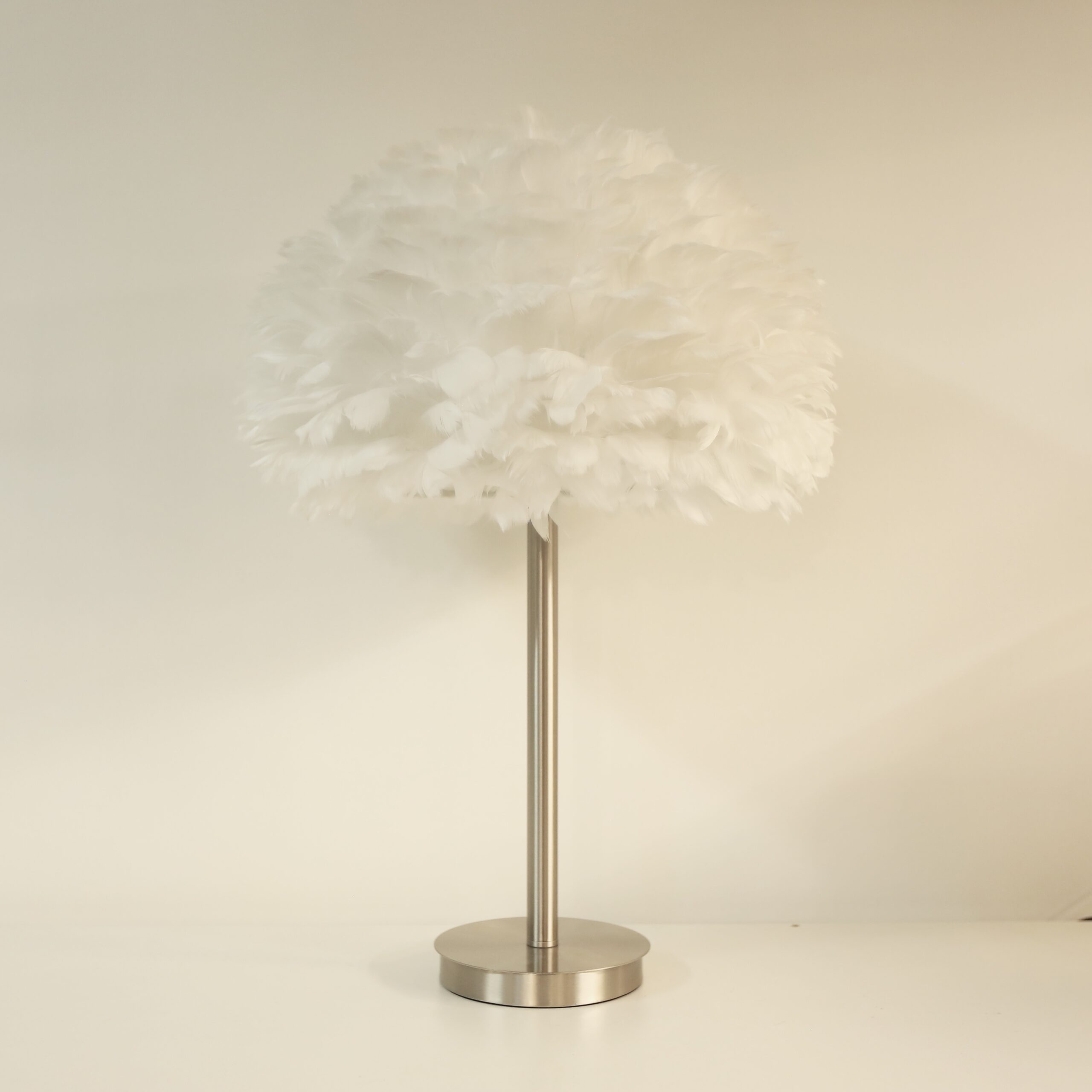 Modern white feather lamp with polished nickel standElegant feather table lamp for bedroom or living roomSoft white feather lamp with nickel finish base