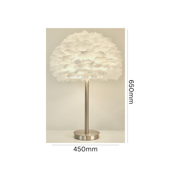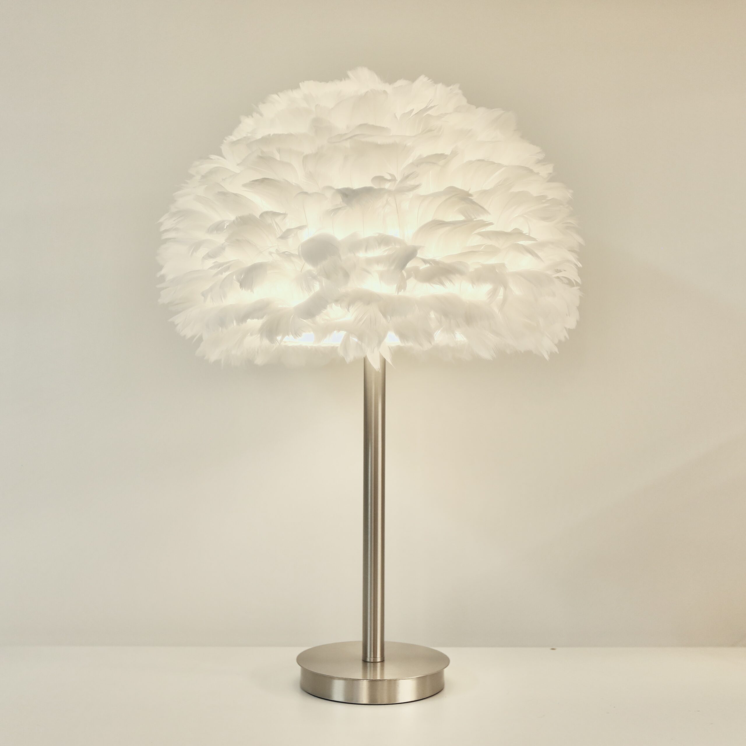 Its soft white feather shade casts a warm, diffused glow, adding a sense of calm and elegance to any room.