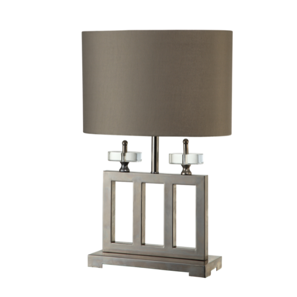 | Height: 555mm Width: 400mm Base: 310mm Shade: 400x230mm Colour/Material: Chrome, Crystal Base / Taupe Gold Shade |