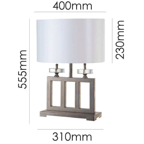 | Height: 555mm Width: 400mm Base: 310mm Shade: 400x230mm Colour/Material: Chrome, Crystal Base / White Oval Shade |