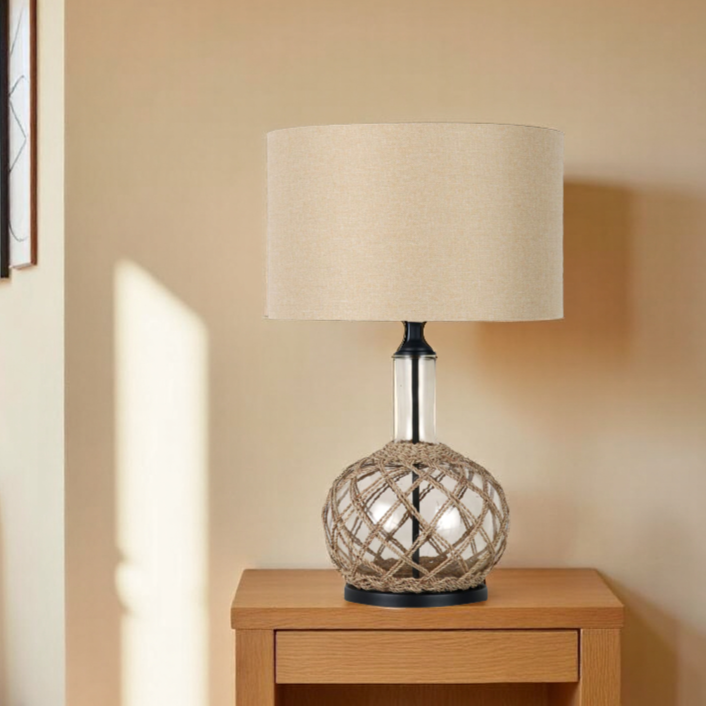 The LLT Ivy Table Lamp captures a relaxed coastal charm with its clear glass base wrapped in natural rope detailing. The design blends rustic texture with modern simplicity, creating a warm and inviting atmosphere. The hessian linen drum shade complements the earthy tones, softening the light for a calming glow.