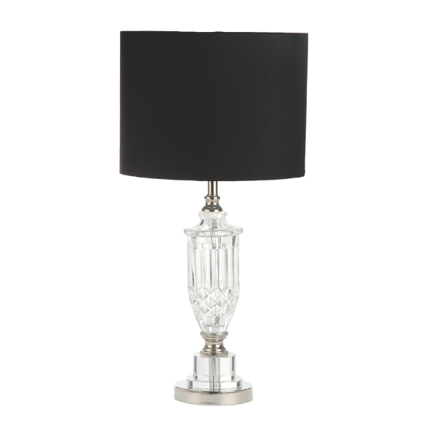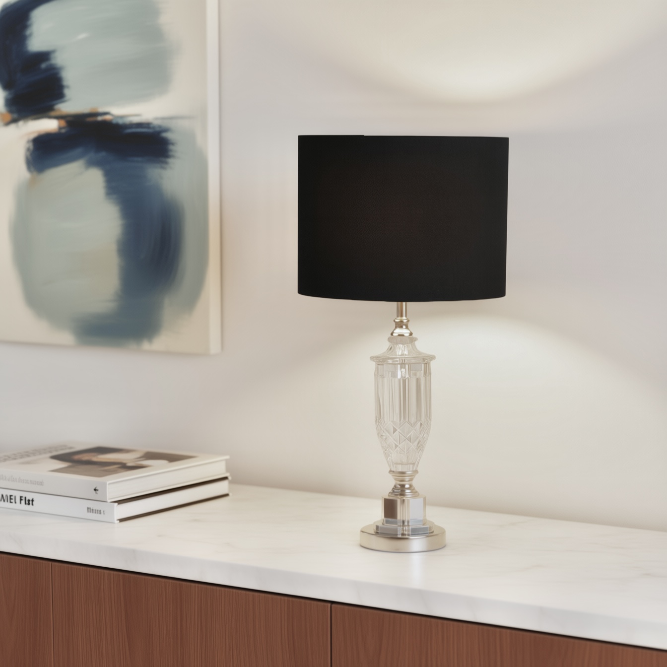 The LLT Janelle Silver Black Table Lamp brings classic elegance into your home. Its crystal-cut base catches the light beautifully, while the shiny nickel accents add a modern touch. In addition, the black faux silk drum shade offers a rich, refined look that enhances any interior.