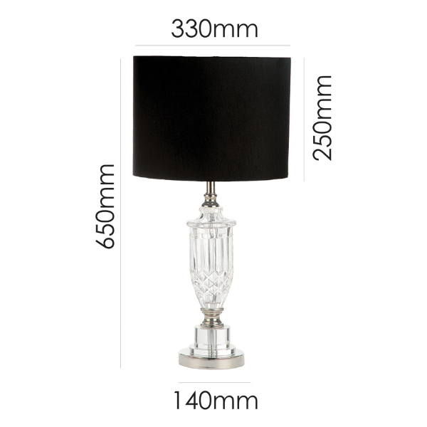 | Height: 650mm Width: 330mm Base: 140mm Shade: 330x330x250mm Colour/Material: Shiny Nickel / Crystal Base, Black Faux Silk Drum Shade |