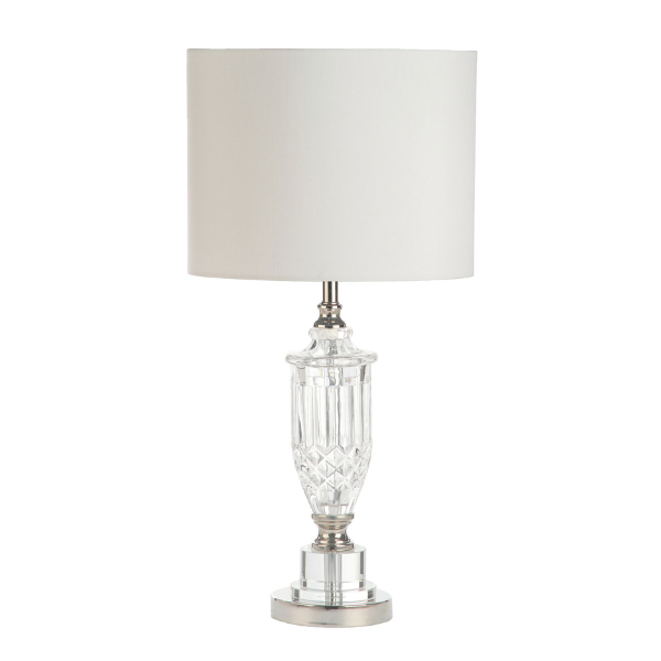 Its clear crystal-cut base reflects light beautifully, while the shiny nickel detailing adds a polished, modern touch. In addition, the white faux silk drum shade softens the glow to create a warm and elegant atmosphere.