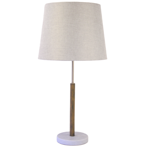 Colour/Material: Unpolished Marble / Nickel / Timber Finish, Mist Linen tapered Shade