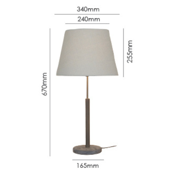 | Height: 670mm Width: 340mm Shade: 240x340x255mm Colour/Material: Unpolished Marble / Nickel / Timber Finish, Beige Linen Shade |