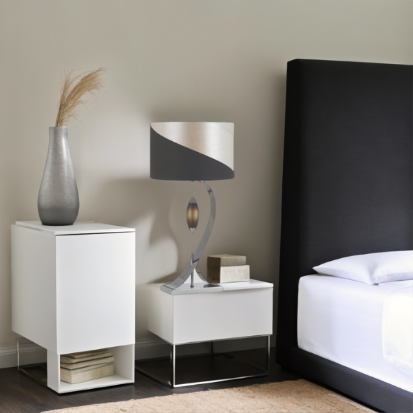 With its smooth chrome curves and sculptural smoke-acrylic detail, this lamp instantly catches the eye. Moreover, the two-tone black and silver shade adds contrast and depth, creating a refined, modern look.