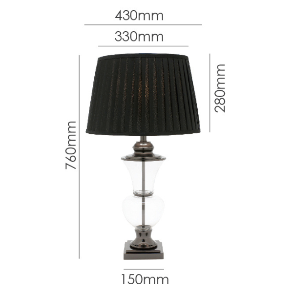 Colour/Material: Chrome / Glass Base, Black Silk / Pleated Round Tapered Shade
