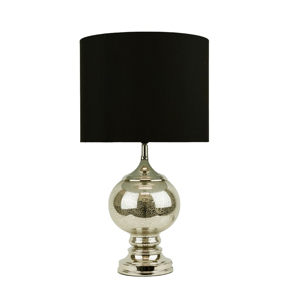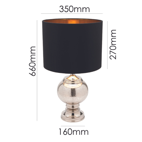| Height: 660mm Width: 350mm Shade: 350x270mm Colour/Material: Chrome, Silver Mercury Glass Base / Black Faux Silk Drum Shade |