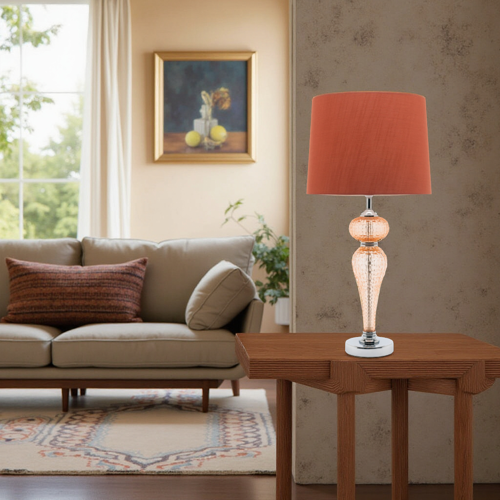| Height: 600mm Width: 300mm Base: 115mm Shade: 300x300x220mm Colour/Material: Chrome/Peach Glass Base, Peach Round Tapered Shade |