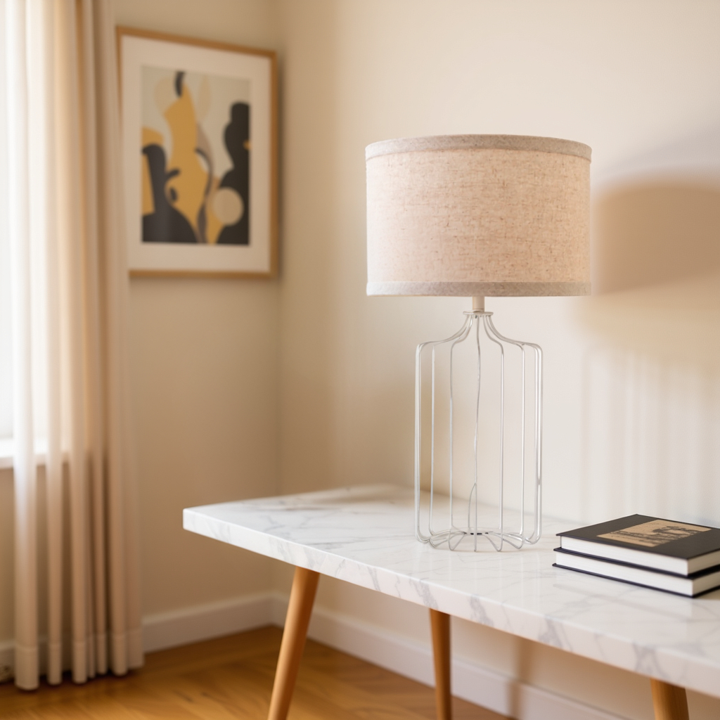 Its tall white painted metal wire base creates an open, airy silhouette that adds visual interest without overwhelming the space.