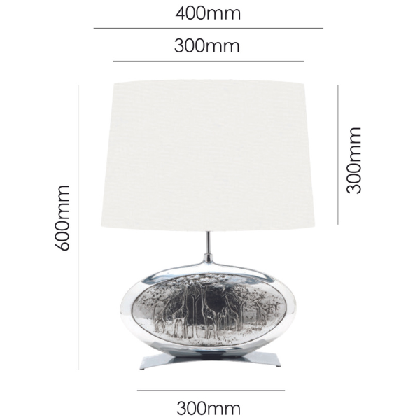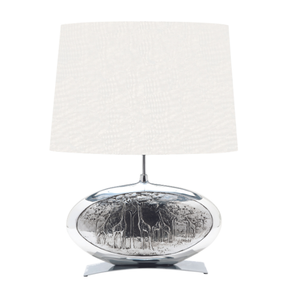The LLT Riff Raff White Table Lamp is more than just a light source—it’s a conversation starter. Its foundation is a polished chrome base showcasing a detailed, hand-finished African wildlife relief. This unique artwork elevates the lamp to a piece of sculptural décor.