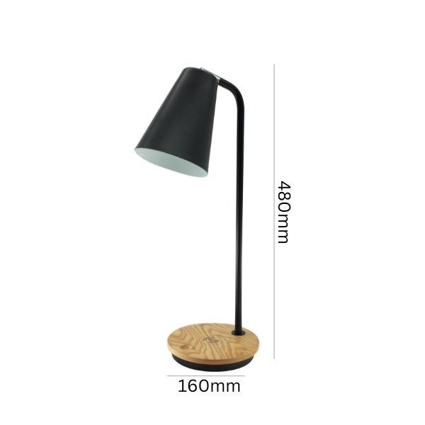 The LLT SMART C BLACK stands 480mm tall, combining a sophisticated faux timber base with a sleek, adjustable black metal shade for targeted illumination.