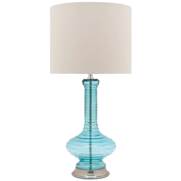Colour/Material: Polished Nickel / Blue Tint Glass Base, White Linen Drum Shade