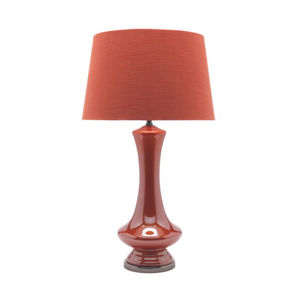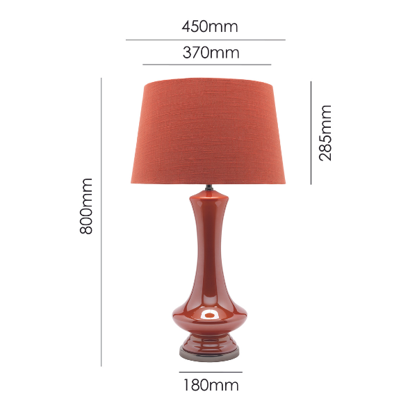 The LLT Tanager Sunset Table Lamp stands an impressive 800mm tall, featuring a fluid, hourglass-shaped base crafted from vibrant burnt orange glass with sleek black chrome accents.