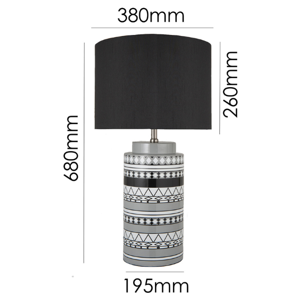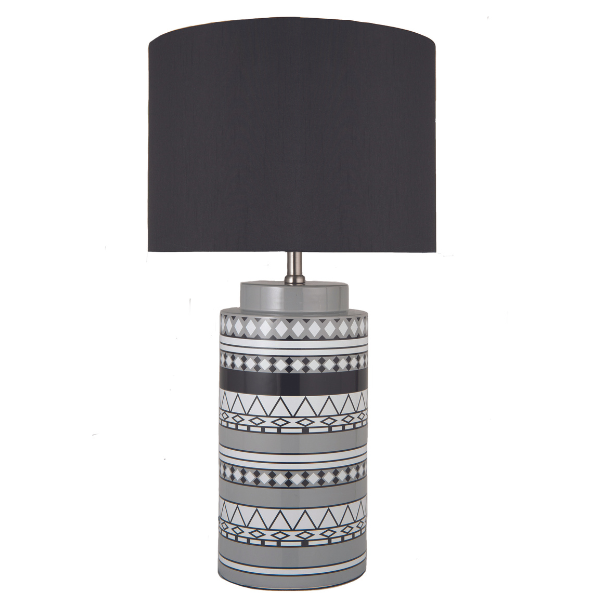 Colour/Material: Black / White Tribal Patterned Ceramic Base / Black Drum Shade