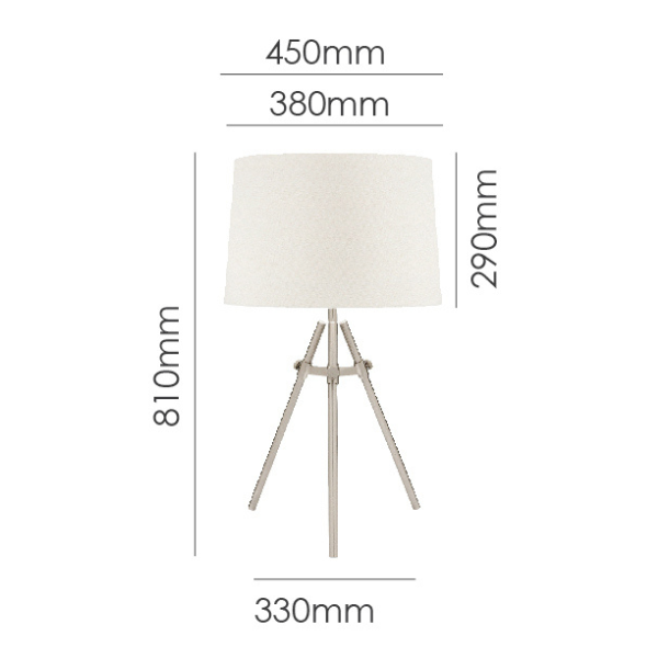 The LLT Tripoli Nickel White Table Lamp features a tripod-style nickel base and a white textured fabric shade, offering a modern statement piece for contemporary interiors.