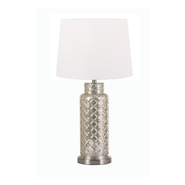 Colour/Material: Brushed Nickel / Detailed Mercury Glass Base, White Faux Silk Round Tapered Shade