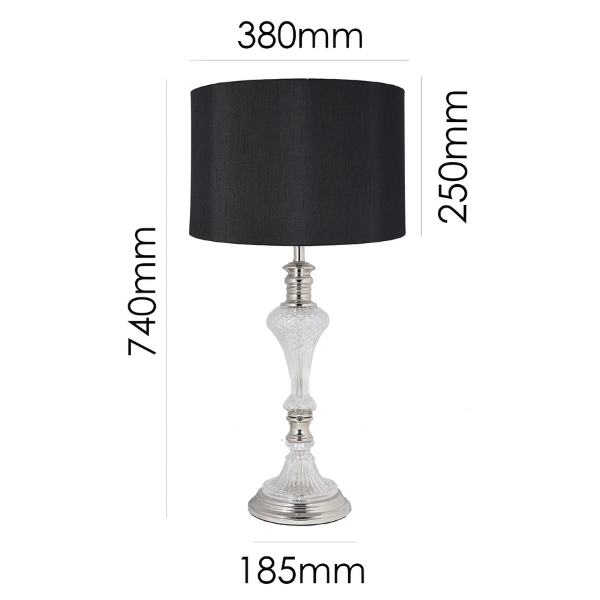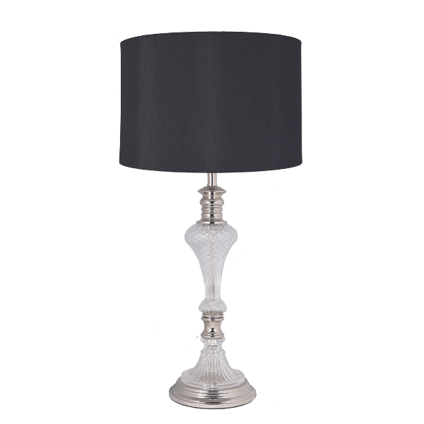 Colour/Material: Shiny Nickel / Glass Base, Black Faux Silk Drum Shade