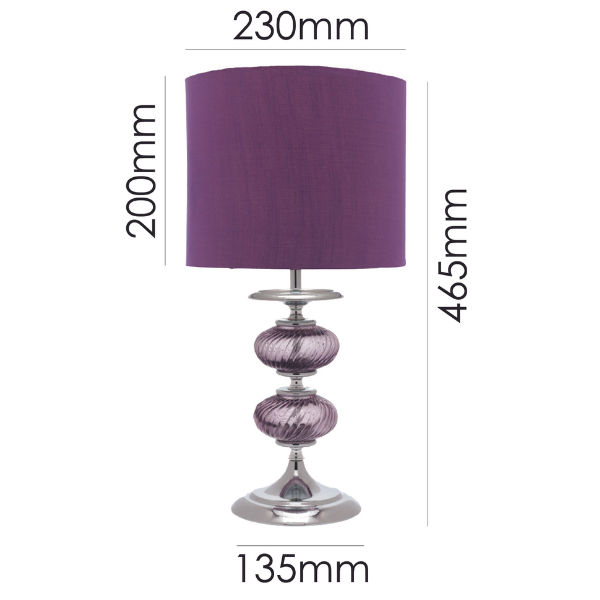 The LLT Violet Table Lamp brings a touch of modern glamour and bold color to your home décor. Its polished chrome base reflects light beautifully, while the vibrant violet fabric shade adds warmth and personality to any room.