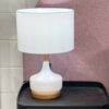 Colour/Material: White Glass / Timber Finish Base, Vanilla Heavy Textured Drum Shade